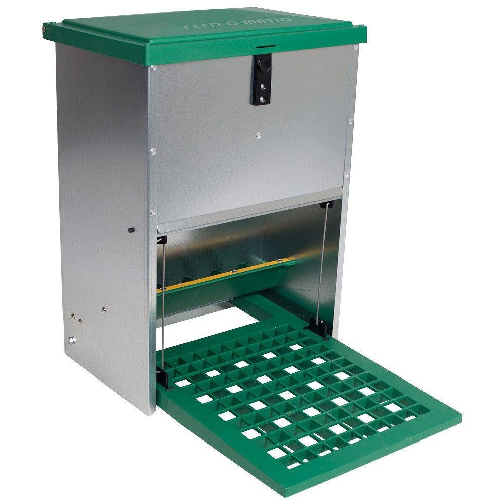 This Feed-O-Matic Vermin-Resistant Poultry Treadle Feeder is an all-weather galvanised and plastic treadle feeder which cannot be operated by vermin* (they aren't heavy enough to trigger the opening of the feed trough), it also cannot be operated by smaller wild birds so huge feed savings can be made. The innovative pedal feature protects the feed stored in the Feedomatic. This automatic rat proof chicken feeder only releases food when a bird steps on the pedal plate. Because only one bird can use the treadle feeder at a time, it's ideal for those with a small number of birds, or if using along side other feeders.