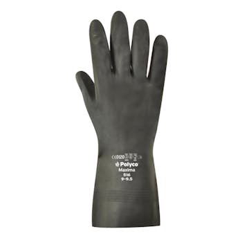 These heavy duty rubber gloves are chemical resistant rubber gloves with a flock lining designed to enhance comfort and protection when handling chemicals and detergents. Resistant to eight different chemicals, Polyco Maxima Safety Gloves are excellent for chemical manufacturing, cleaning and food handling applications.