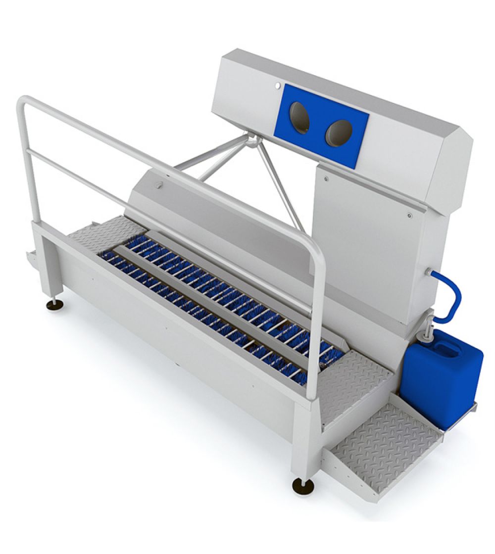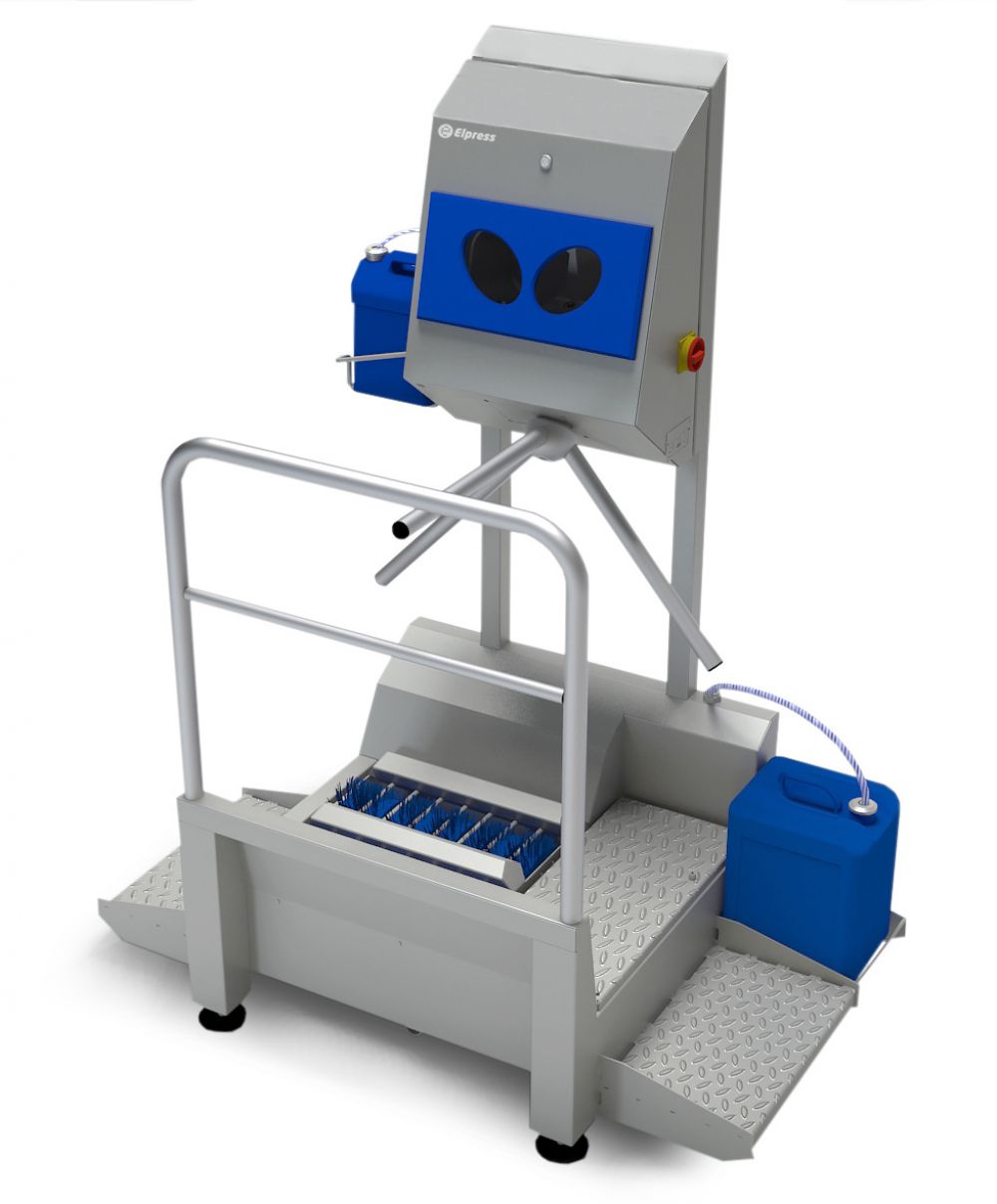 The DZW-HDT does two things at the same time: it cleans the soles and disinfects the hands. The rotating brushes are automatically humidified. The hand disinfection is regulated by sensors. Spray nozzles above and underneath the hand ensure a good atomization of the disinfectant. After the hands have been disinfected, the turnstile will be released and one can proceed to the next room.